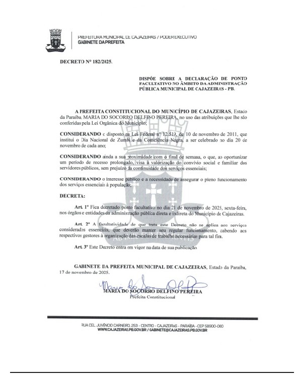 A prefeita de Cajazeiras, Corrinha Delfino através de decreto publicado na tarde desta segunda-feira (17) torna facultatico o funcionamento das repartições públicas municipais na próxima sexta-feira (21) em virtude do feriado do dia 20, Dia Nacional de Zumbi e da Consciência Negra, que é feriado nacional.